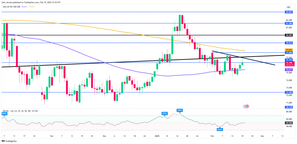 The 14-day RSI remains just below the 50 level suggesting bearish momentum remains intact for now. A break above the 50 level could be a hint that momentum may be shifting to favor bulls and could push price toward resistance at 77.68 and potentially beyond.