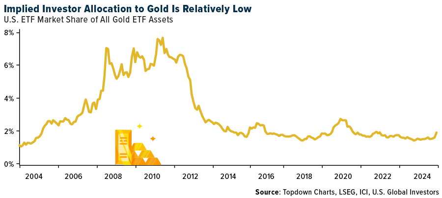 Despite the rally, retail investors are still sorely underexposed. Gold-backed ETF assets currently represent less than 2% of all ETF assets, down from approximately 8% in 2011. Investment in gold ETFs has significantly picked up since February, but holdings are still off by about 19% from their highs in October 2020.
