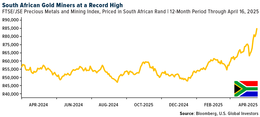 This rally isn’t limited to US-based gold stocks. South African producers, as measured by the rand-priced FTSE/JSE Precious Metals and Mining Index, hit a new record high as the price of gold has exploded to the upside, crossing above R60,000 per ounce this month for the first time ever.