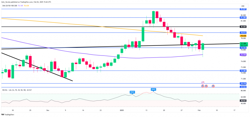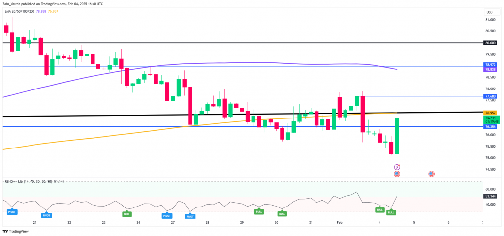 Looking at price action and a four-hour candle close above the recent swing high at 77.68 is needed for a change in structure. This could further embolden bulls and push prices back toward the psychological 80.00 a barrel mark.