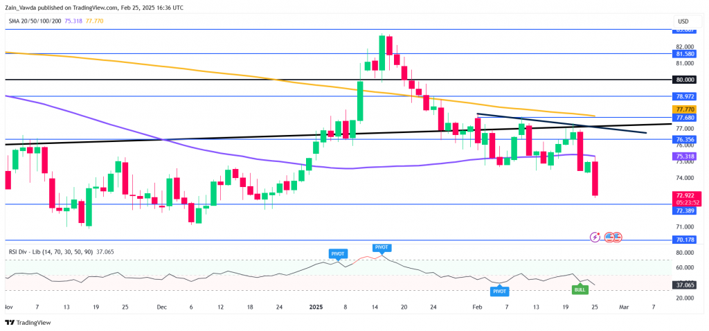 Brent is now approaching a swing low from December 2024 resting at 72.39 before support at 70.18 and the psychological 70.00 handle come into focus.