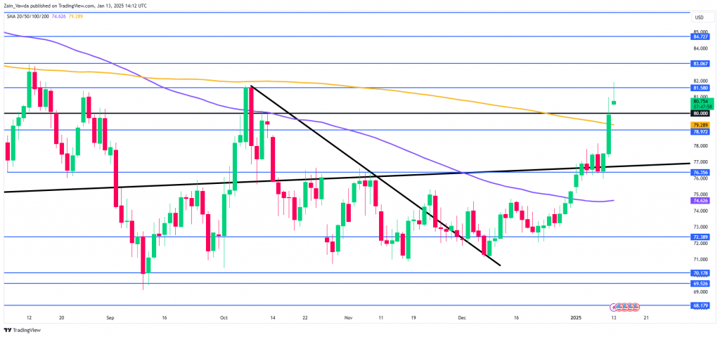 If bulls were to seize control of the narrative then Oil could eye resistance at 81.58 and 83.00 respectively.