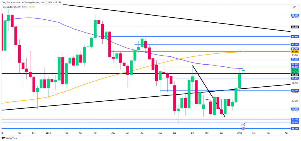 Dropping down to a daily timeframe and immediate support rests at $80 a barrel mark with the 200-day MA resting below at 79.28.