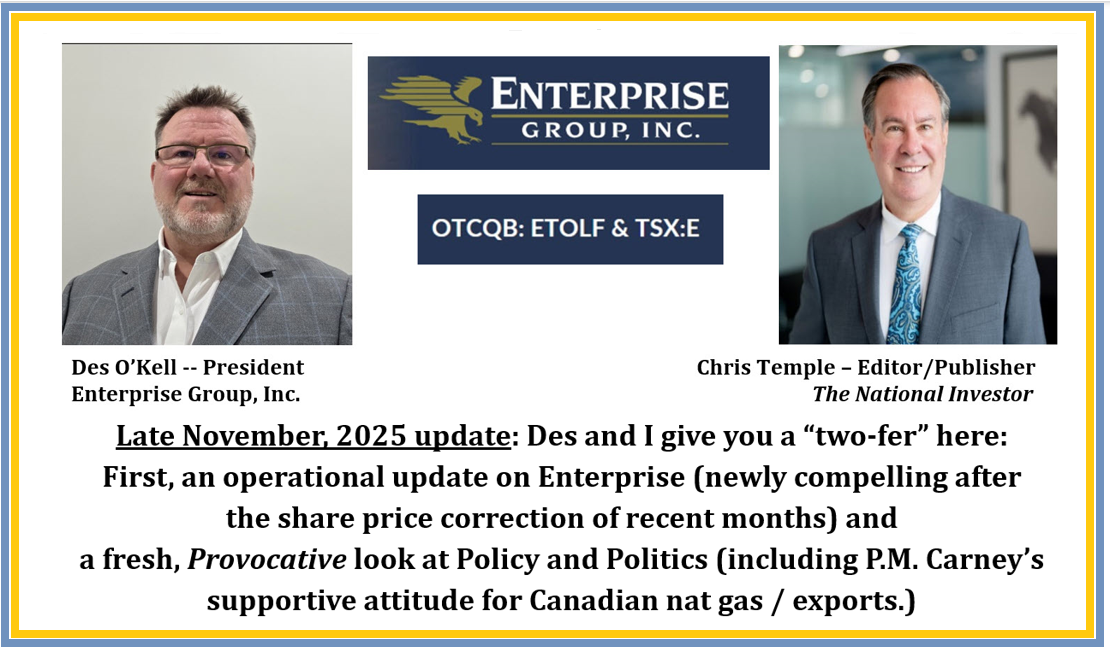 Another company head I just had a similar discussion with–this time as it specifically affects Canada’s energy industry–was Des O’Kell, President of Enterprise Group (TSX-E; OTCQB-ETOLF).