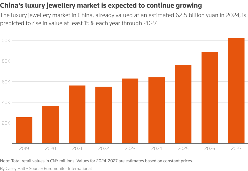 As rising gold prices in 2024 pushed investors toward bullion and coins and gold jewellery sales in China fell 24.69% to 532.02 tons, Laopu twice raised prices on its designer jewellery and trinkets. It again upped prices by 5-12% last month.