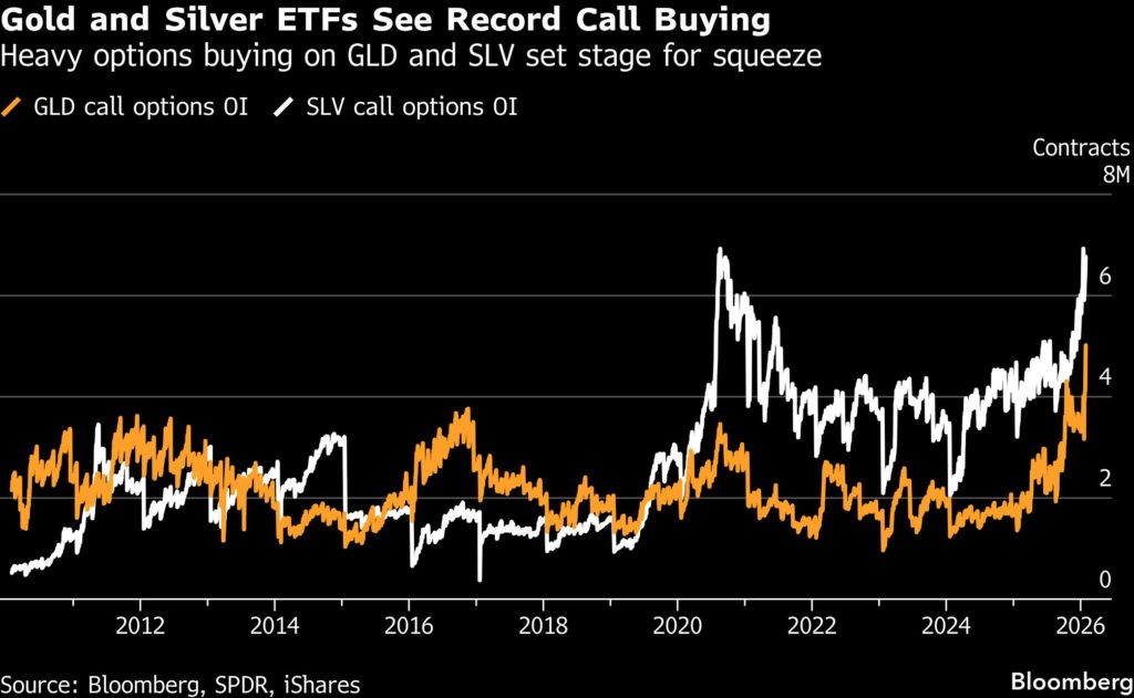Seen by some investors as a cheap way to bet on market rallies, posts on the Reddit groups that had helped power previous retail surges into silver showed the gains of over 1,000% that could be made from betting on silver’s rapid climb. The biggest gold and silver ETFs each saw record open interest and trading volumes on call options in recent weeks, and the volume of call options on SLV exceeded that of the main ETF that tracks the Nasdaq 100 index of tech stocks.