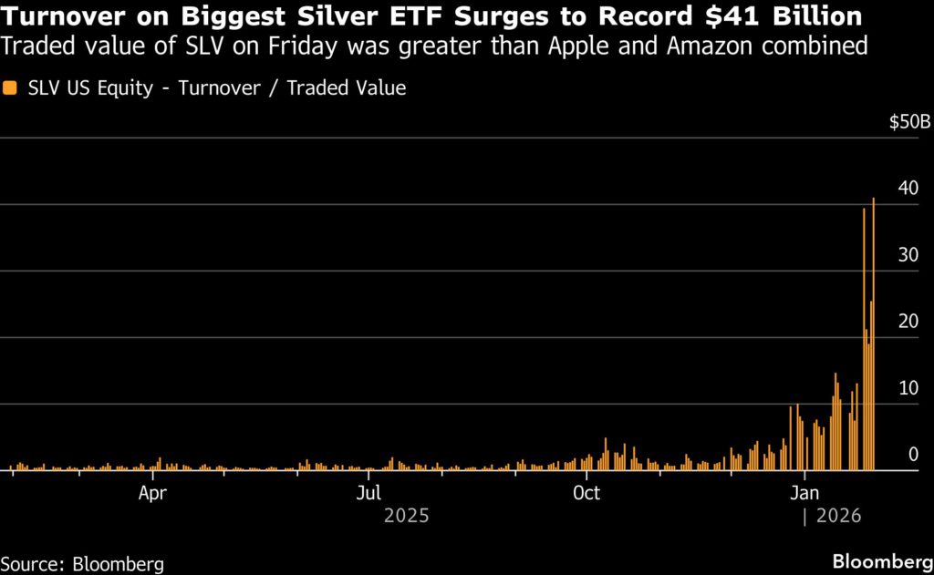 On Friday, iShares Silver Trust, the largest exchange-traded fund backed by silver, known by its ticker SLV, recorded more than $40 billion in turnover. That made it one of the most traded securities on the planet, when just months ago it would rarely see more than $2 billion traded.