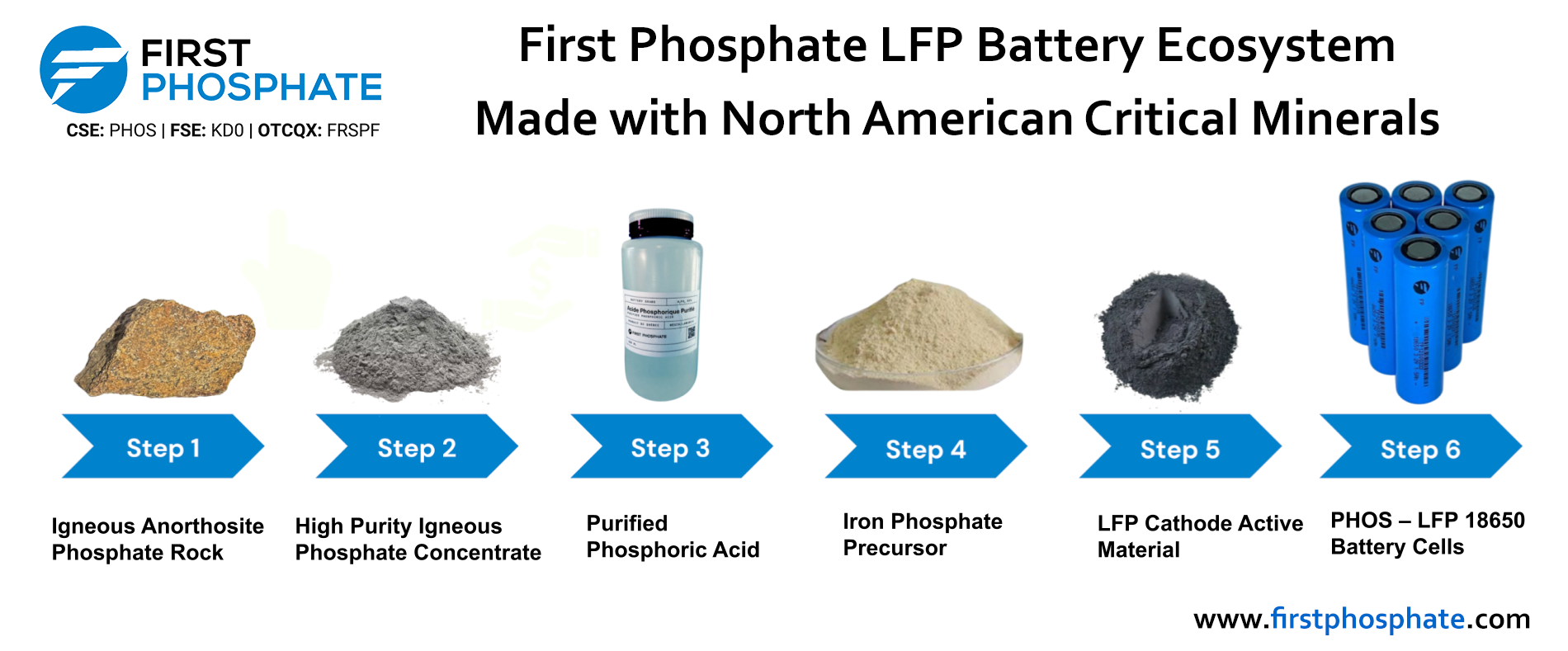 First Phosphate is advancing a rare, high-purity igneous phosphate resource in Saguenay–Lac-Saint-Jean, Quebec, with the objective of supplying high purity phosphate-based downstream materials required for LFP batteries. The Company’s mine-to-market strategy is focused on onshoring critical battery materials, reducing supply chain risk, and supporting North American energy security.