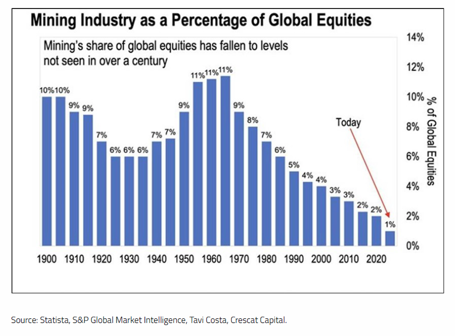 Hathaway also noted that the gold mining stocks currently have an aggregate market capitalization of approximately $550 billion, which is only 0.43% of the global total. Mining stocks (of which gold mining equities are a small subset) are now at their smallest share of global equities since 1900, he added.