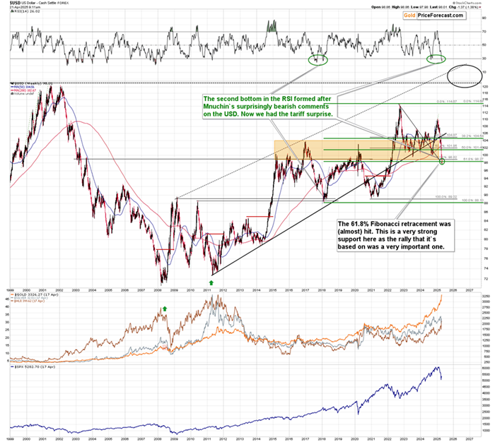1. This decline took the USDX to the 61.8% Fibonacci retracement based on the 2008 – 2022 rally, which provides VERY strong support. It was only somewhat below the same retracement but based on the 2020 – 2022 rally.