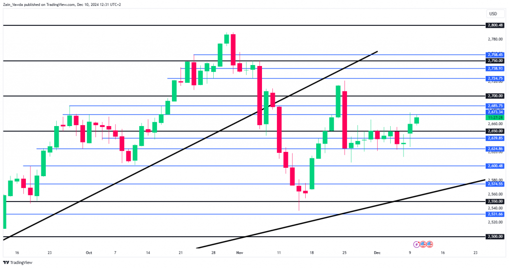 From a technical analysis standpoint, Gold on a daily timeframe is trading above the range it held last week but below a key resistance area around the 2675 handle.