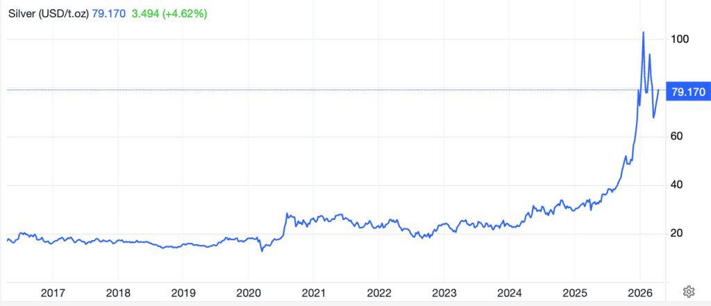 Forecasts as of mid-April for 2H/26 remain bullish, clustering around $80–$125/oz, with select bull cases at or above $125/oz. For instance, BMO is calling for $160, and Bank of America $135 to $309!, Citi sees $150 in a possible, “physical supply squeeze.”