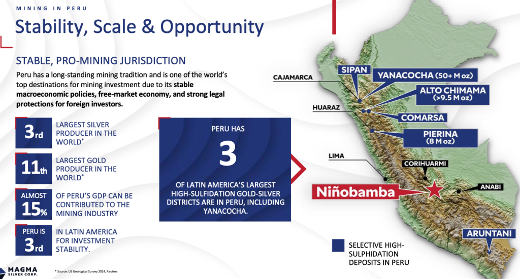 An early-stage junior worth a closer look is Magma Silver (TSX-v: MGMA) / (OTCQB: MAGMF) with 100% of the high-sulfidation Ag/Au Niñobamba project. Permitting & drilling programs are advancing, with a focus on resource expansion & NI 43-101 compliance.
