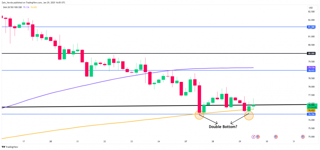 Dropping down to a four-hour chart and as you can see price has formed a double bottom pattern at the key support level of 76.35.