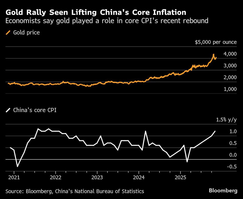 Core inflation last month saw its fastest increase in almost two years, unexpectedly helping the broader consumer-price index end a stretch of three months at or below zero. The precious metal in October contributed close to half or more of the 1.2% jump in the core index, which excludes food and energy, according to estimates from Goldman Sachs Group Inc. and Shenwan Hongyuan Group Co.