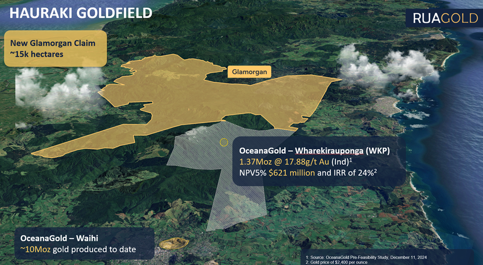 The Glamorgan Project is located within the highly prospective Hauraki Goldfield on the North Island of New Zealand. The district has historically produced 15Moz gold and 60Moz silver, with active mining operations ongoing today. RUA GOLD’s tenements are adjacent to OceanaGold’s Wharekirauponga Project, which recently advanced through Fast-Track permitting process in 112 days, and is now under construction. [1]