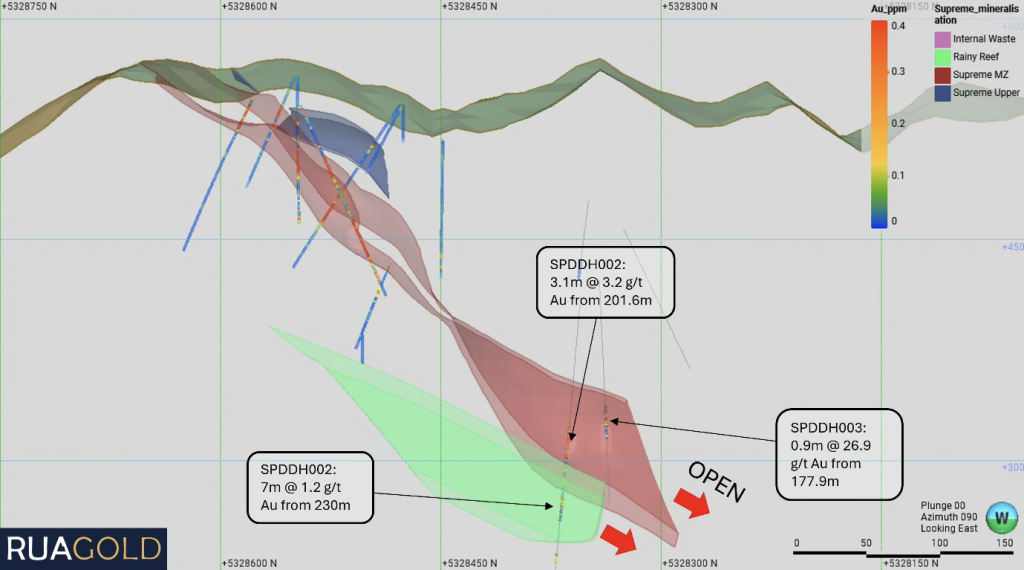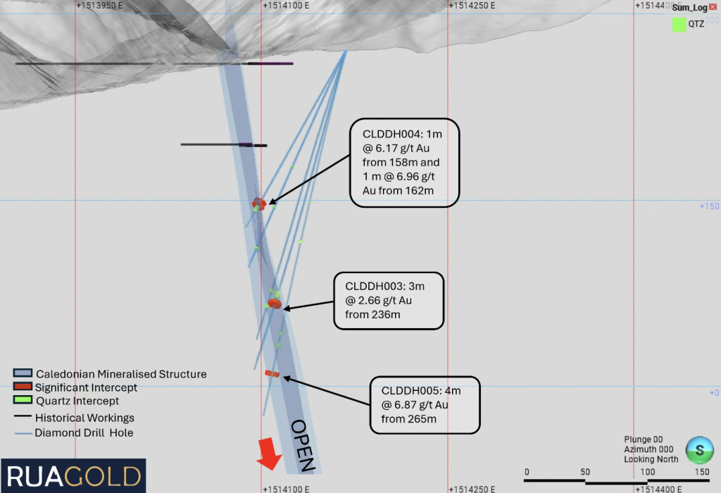 - Mineralization has been intersected 186m below historical workings at Caledonian, further highlighting untapped depth potential of the Reefton deposits and validating RUA’s exploration strategy.