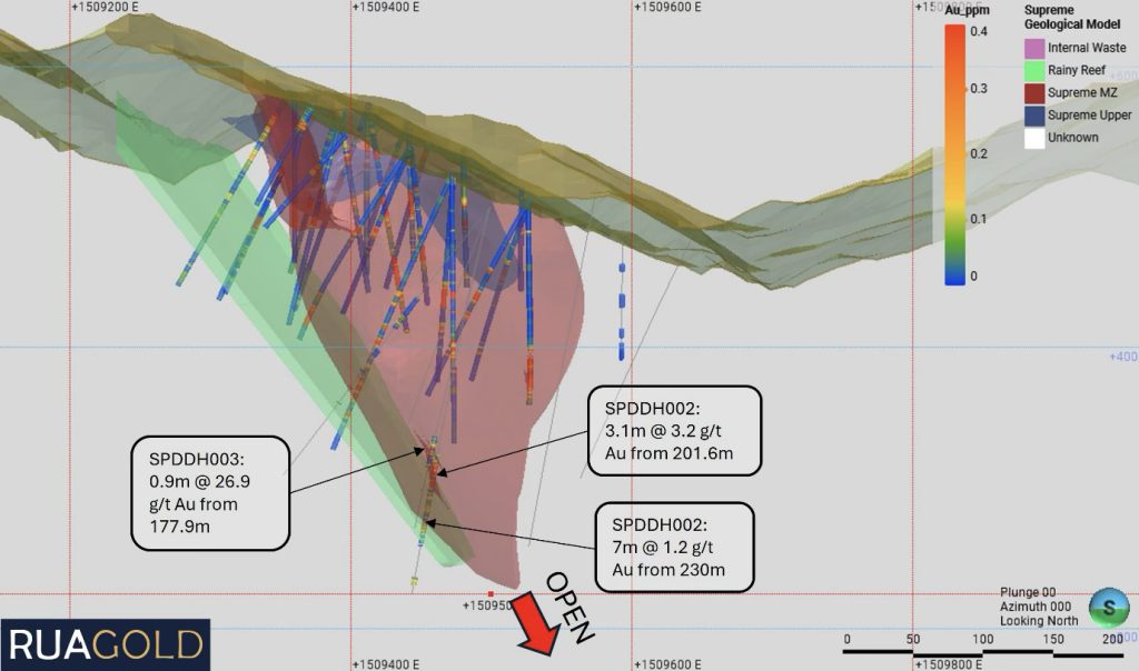 - This broad step out increases down-plunge extent of the Supreme resource from 250m to 400m and extending mineralization to approximately 230m depth, with the system remaining open to the south-southwest.