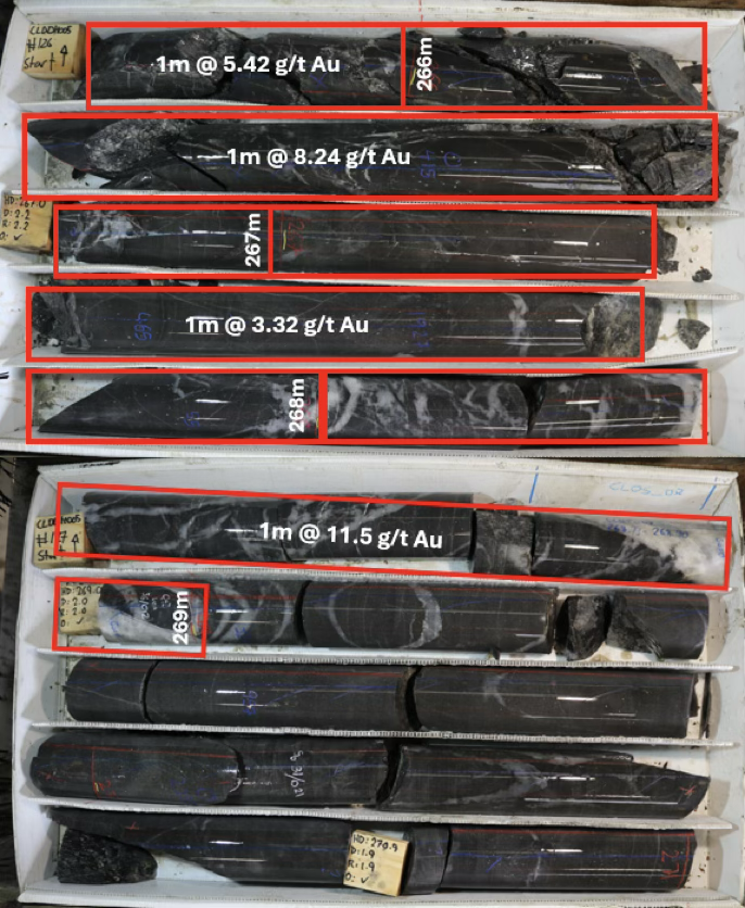 - CLDDH005 was the standout hole, returning 4.0m @ 6.9 g/t Au from 265.0m (Figure 5). Mineralisation persists 170m beneath the historic mine workings and remains open at depth, intersecting. Importantly, the strongest mineralisation is associated with a structurally complex zone of metasediments, quartz veining/stockwork, graphitic alteration and abundant arsenopyrite (Figure 6).