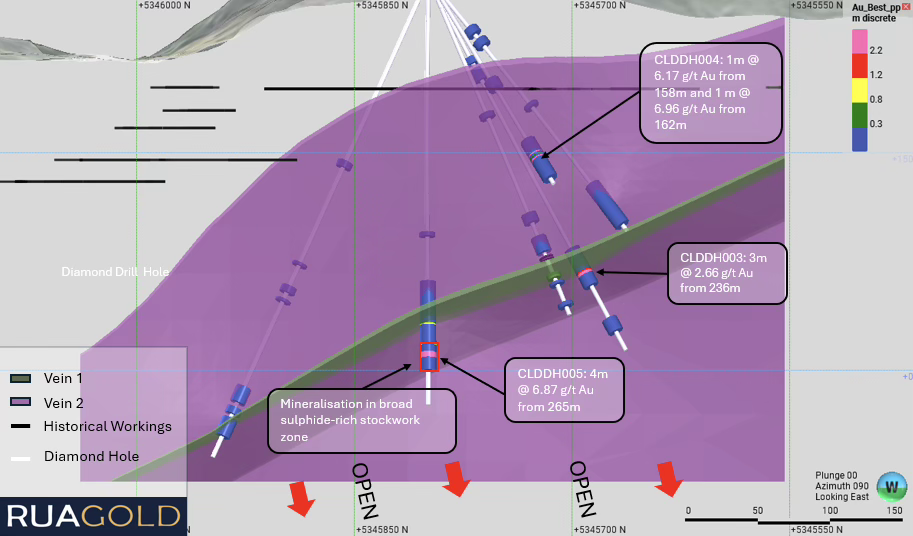 - CLDDH004 intersected two discrete high-grade gold intervals of 1.0m @ 6.17 g/t Au from 158.0m and 1.0m @ 6.96 g/t Au from 162.0m, reinforcing the continuity of mineralisation. The hole intersected, with the close spacing of the intervals suggesting a structurally complex mineralised zone rather than a single isolated vein.