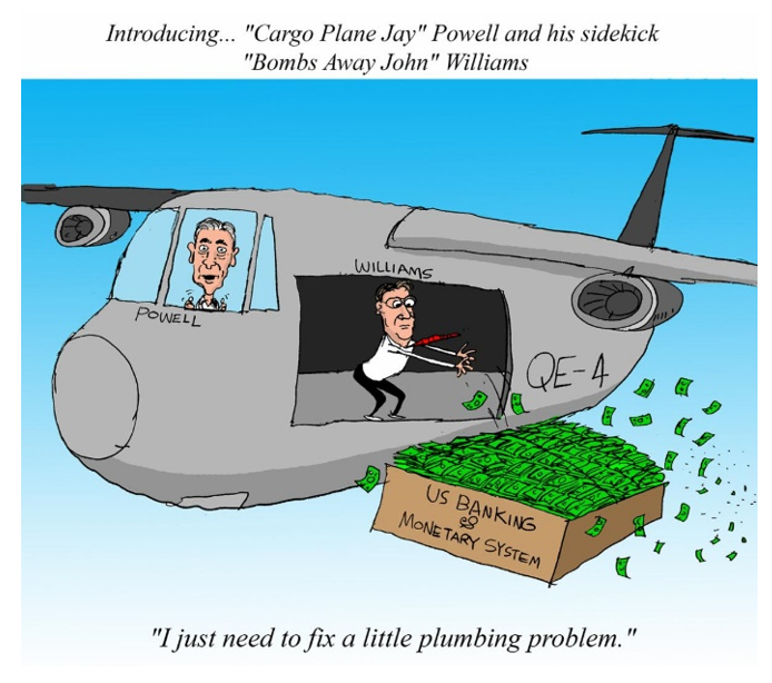 I quipped at that time that (as nicely illustrated, as always, by my crack long-time cartoonist Jerry King) the “Helicopter Ben” Bernanke of the past had been replaced by “Cargo Plane Jay” and his need to Inflate or Die.