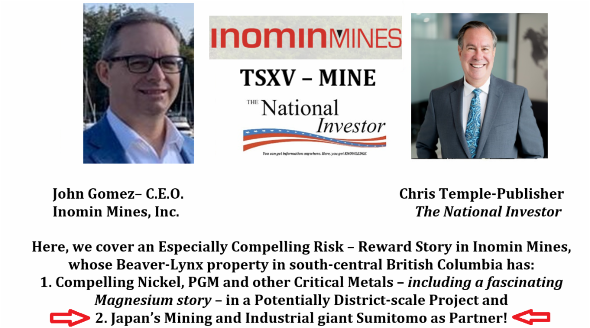 The company is Inomin Mines, Inc. (TSXV-MINE) — and you can listen to and learn much from my visit with John RIGHT HERE or by clicking on the below graphic.