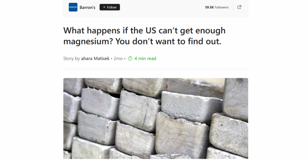 –> I’ve warmed up to magnesium as perhaps THE next critical metal story that’s going to be embraced. As you’ll hear (and read) at the link, this critical metal is VERY likely to be the “next antimony” as investors come to understand the stark supply vulnerability and space-age tech around magnesium.