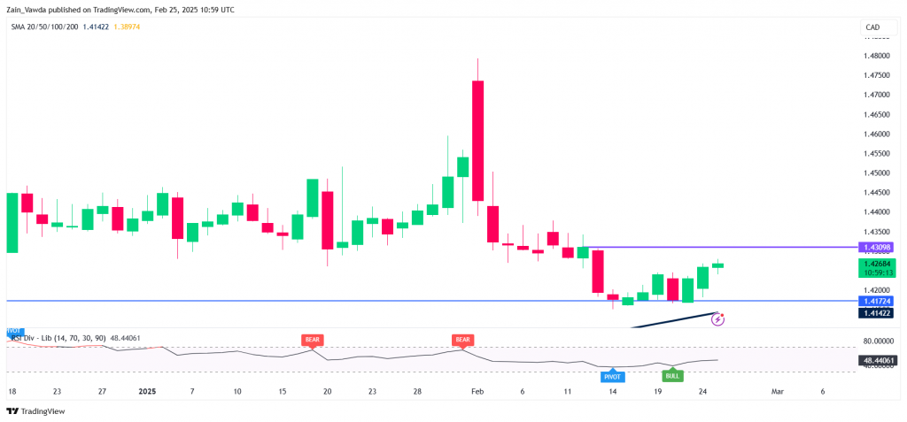 ● The US Dollar’s recovery on tariff talk is causing the USD/CAD pair to bounce.