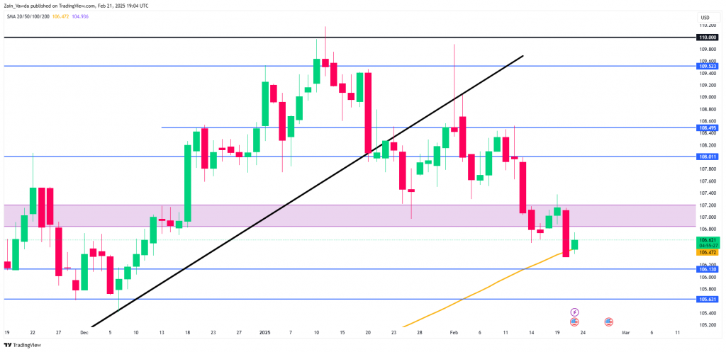 Currently the DXY has found support at the 100-day MA resting at 106.47 with a bullish inside bar candle close on Friday.